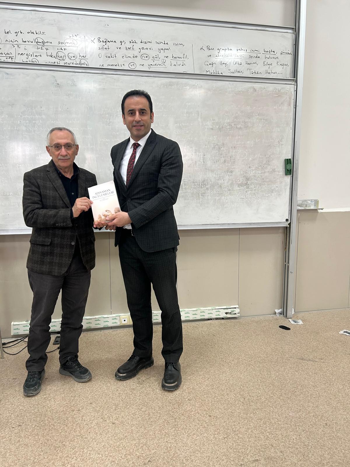 Adıyaman Üniversitesi Ortak Dersler Koordinatörlüğü tarafından bu yıl uygulamaya konan ve Adıyaman'ın tarihi, kültürel ve dil (ağız) özelliklerinin öğrencilere öğretilmesinin amaçlandığı "Adıyaman Ağzı" dersinde Ahmet Akil Yağınlı'yı misafir ettik. Adıyaman ağzı ve kültürü ile ilgili çok sayıda çalışması olan Yağınlı, öğrencilerimize "Adyaman"ı Düşınom Da" şiirindeki kavramları Adıyaman kültürü ile ilişkilendirerek sundu. Dersin sonunda Kent Kültürü Uygulama ve Araştırma Merkezi Müdürümüz Doç. Dr. Türker Barış Bulduk değerli öğretmenimize "Adıyaman İli ve Yöresi Söz Varlığı" ve "Adıyaman İncelemeleri" eserlerini takdim etti.